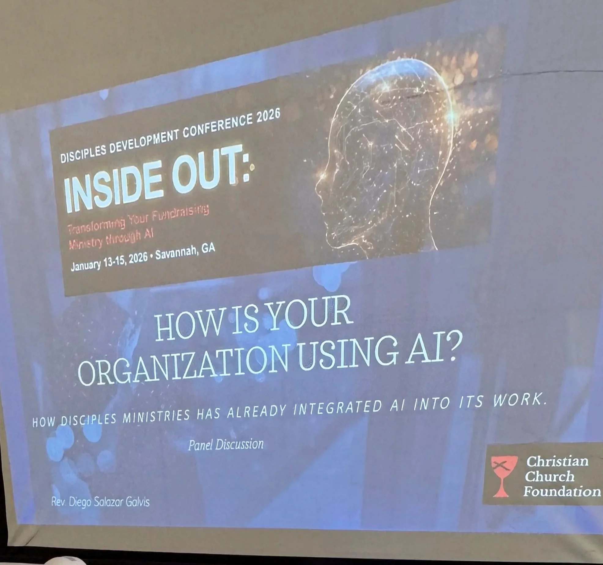 On January 13 – 15, 2026, Christian Church Foundation Disciples Development Conference, Savannah, GA, Inside Out: Transforming Your Fundraising Ministry through AI, Keynote Speaker: Nathan Chappell, Chief AI Officer at Virtuous Software and Author. Pastor Diego Salazar – Galvis, Latinx Community Minister, University Christian Church, San Diego was a panelist on how Disciples Ministries have already integrated AI into its work. Pictured is the panelists’ presentation cover.