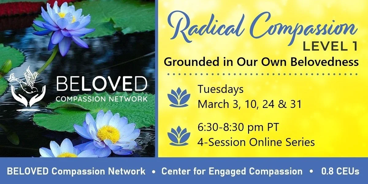 Radical Compassion-Level 1: Grounded in Our Own Belovedness beginning on March 3 consists of four, 2-hour, online sessions that explore the foundation principles of compassion and deepen participant’s grounding, self-worth, and connectedness with their own compassionate core and the Sacred Source of Compassion that holds the universe.