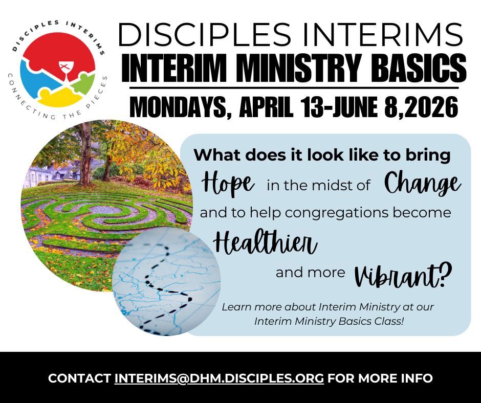 The Spring Training will be each Monday from April 13 through June 8 (with an orientation session on April 12). The 8 sessions will cost $600. Many Regional ministers are willing to share in the cost if the student offers to serve in an interim setting in the future. Email us at interims@dhm.disciples.org or visit the Disciples Interims website for more information and the application link.